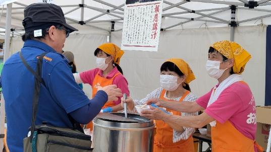 地元で受け継がれている野菜たっぷりの「報恩講汁」が参加者に振る舞われ、長時間走り続けたライダーたちの心と体を温かく包み込みました。
